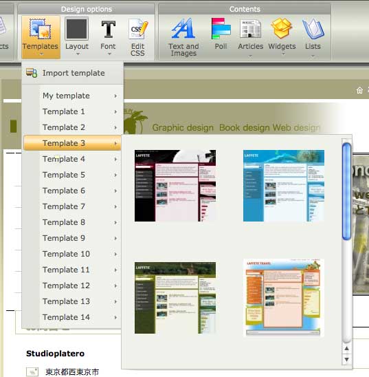 [settings], [Design options],[Contents]と並んでいる3つのカテゴリーの中の真ん中、[Design options]のブロック中にある[Templates]を押します。